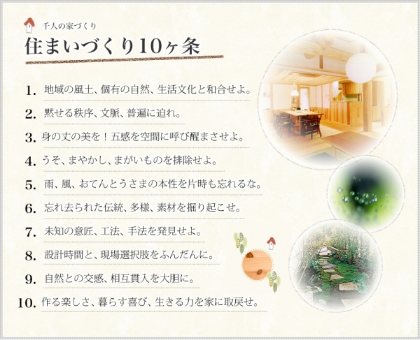 その「宣言文」の新精神に少し触発されて作ったのが、自家製の建築版ヌーベルクィジーヌとも言うべき、この「千人・住まいづくり10ヶ条」です。